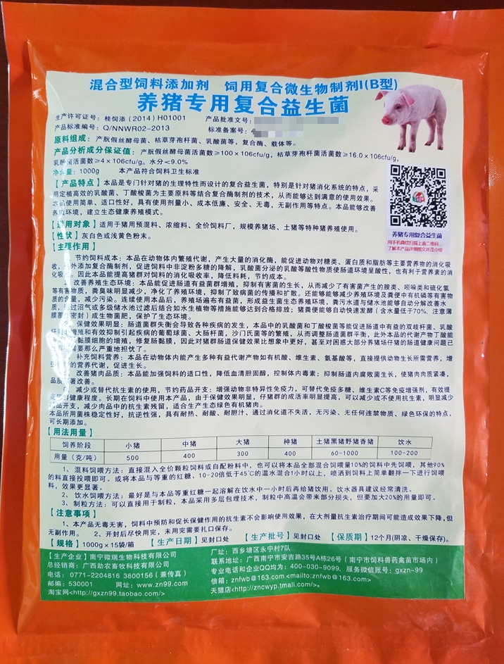1. 養豬專用復合益生菌:針對養豬的腸道特性而設計,由枯草芽孢桿菌、地衣芽孢桿菌、雙歧桿菌、高密度的乳酸菌等與酶制劑組合而成,特別是在產品中添加了昂貴的丁酸梭菌,對保障動物腸胃功能,大幅度降低腹瀉,降低臭氣氨氣,改善提高豬肉品質,降低料耗等比一般益生菌效果更好。創新的多層包埋技術可以用于規模飼料廠的制粒,每噸飼料僅需10元左右的成本即可。