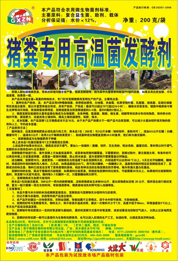 3. 豬糞專用高溫菌發酵劑:專門針對豬糞的高PH值、營養分析等而設計專業的微生物菌群發酵劑,速度比自然發酵快,是解決養豬場糞污處理、進行生態養殖生產生物菌肥的高性價比產品。本產品成本低廉,效果顯著!