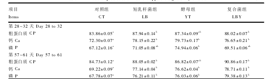 結(jié)果表明:1)第1階段中,與對(duì)照組相比,各益生菌組的末重以及短乳桿菌組和復(fù)合菌組的平均日增重顯著提高(P<0.05),短乳桿菌組和酵母組的料重比顯著降低(P< 0.05;第2階段中,復(fù)合菌組的末重顯著高于對(duì)照組(P<0.05);整個(gè)試驗(yàn)期,與對(duì)照組相比,短乳桿菌組和復(fù)合菌組的平均日增重顯著提高(P<0.05),復(fù)合菌組的料重比顯著降低(P<0.05} 0 2}在第32天,與對(duì)照組相比,各益生菌組糞便中酵母數(shù)量顯著升高(P<0.05),短乳桿菌組和復(fù)合菌組糞便中乳酸菌數(shù)量顯著升高、大腸桿菌數(shù)量顯著降低(P<0.05);在第61天,與對(duì)照組相比,各益生菌組糞便中乳酸菌和酵母數(shù)量顯著升高(P<0.05),短乳桿菌組和復(fù)合菌組糞便中大腸桿菌數(shù)量顯著降低(P<0.05) 0 3)在第32天,短乳桿菌組和復(fù)合菌組的粗蛋白質(zhì)、鈣表觀消化率以及酵母組的鈣、磷表觀消化率較對(duì)照組顯著升高(P<0.05);在第61天,短乳桿菌組和復(fù)合菌組的粗蛋白質(zhì)、鈣、磷表觀消化率以及酵母組的鈣、磷表觀消化率較對(duì)照組顯著提高(P<0.05) 0 4)在第32天,與對(duì)照組相比,各益生菌組的血清免疫球蛋白A (IgA)含量以及復(fù)合菌組的血清總蛋白}T P)、球蛋白(GLB}、免疫球蛋白G (IgG)含量顯著升高(P<0.05);在第61天,與對(duì)照組相比,短乳桿菌組的血清TP, GLB , IgA和IgG含量,酵母組的血清TP和IgG含量,復(fù)合菌組的血清GLB,IgA和IgG含量顯著升高(P<0.05)。