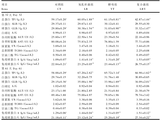 分別于試驗(yàn)的第32,61天,每個(gè)重復(fù)隨機(jī)選擇2頭豬,前腔靜脈采血5 mL,分離血清后一20℃保存?zhèn)溆谩2捎?/span>HITA C HI-7020自動(dòng)生化分析儀測(cè)定血清中總蛋白(T P)、白蛋白(ALBS、球蛋白CGLBJ ,葡萄糖(GLUE、尿素氮(UN)、總膽固醇}TCHO)、甘油三酷}TG)含量及谷丙轉(zhuǎn)氨酶SALT)和谷草轉(zhuǎn)氨酶BAST)活性,測(cè)定所用試劑盒購(gòu)自中生北控生物科技股份有限公司;采用酶聯(lián)免疫吸附試驗(yàn)(ELISA)法測(cè)定血清中免疫球蛋白A }IgA)、免疫球蛋白G }IgG)含量,試劑盒購(gòu)自美國(guó)B ethyl公司。