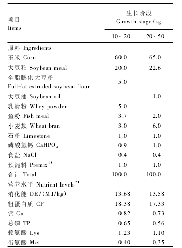 試驗(yàn)用基礎(chǔ)飼糧為參照NRC (1998)配制的粉狀飼料,分為10 } 20 kg和20 } 50 kg 2個(gè)生長(zhǎng)階段配制,其組成及營(yíng)養(yǎng)水平見(jiàn)表1。試驗(yàn)豬舍為半敞開(kāi)式建筑模式,水泥地面圈養(yǎng),自由采食和飲水。按豬場(chǎng)常規(guī)程序進(jìn)行免疫、驅(qū)蟲、消毒和管理等。