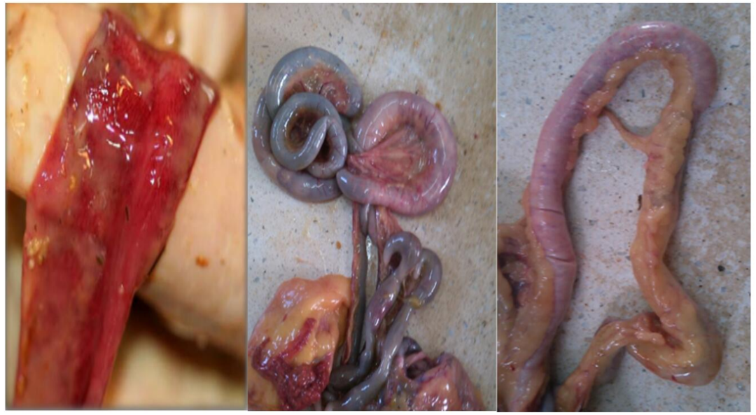感染初期剖檢可見十二指腸黏膜增厚、腫脹,黏膜表面覆蓋淺黃綠色纖維素性假膜。小腸中段可能極度脹大,腸黏膜脫落,腸壁變薄且脆弱;后期腸黏膜壞死,腸道表面呈污灰色、黑褐色或藍綠色,腸腔內充滿黑色糊狀物,有腥臭味。腸道還可能出現充氣、鼓氣現象,腸管增粗,內有未消化的飼料顆粒。十二指腸和空腸漿膜常有大小不一的出血斑點,其他臟器多為瘀血,無特異變化,病程較短,常呈急性死亡。